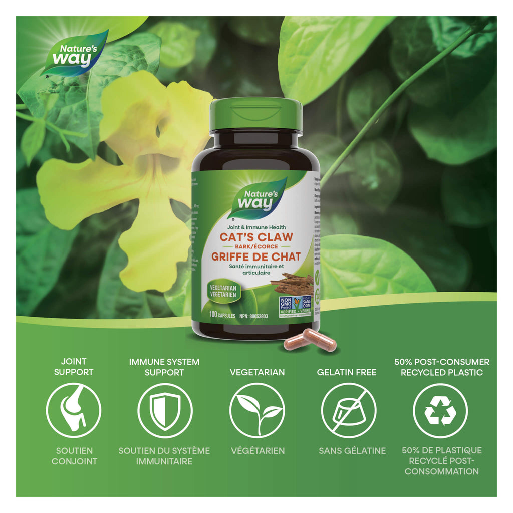 Nature's Way Cat's Claw Bark is used in herbal medicine to support the immune system and to help relieve joint pain associated with osteoarthritis and rheumatism. Nature's Way Cat's Claw Bark is Vegetarian and Non-GMO Project Verified.
