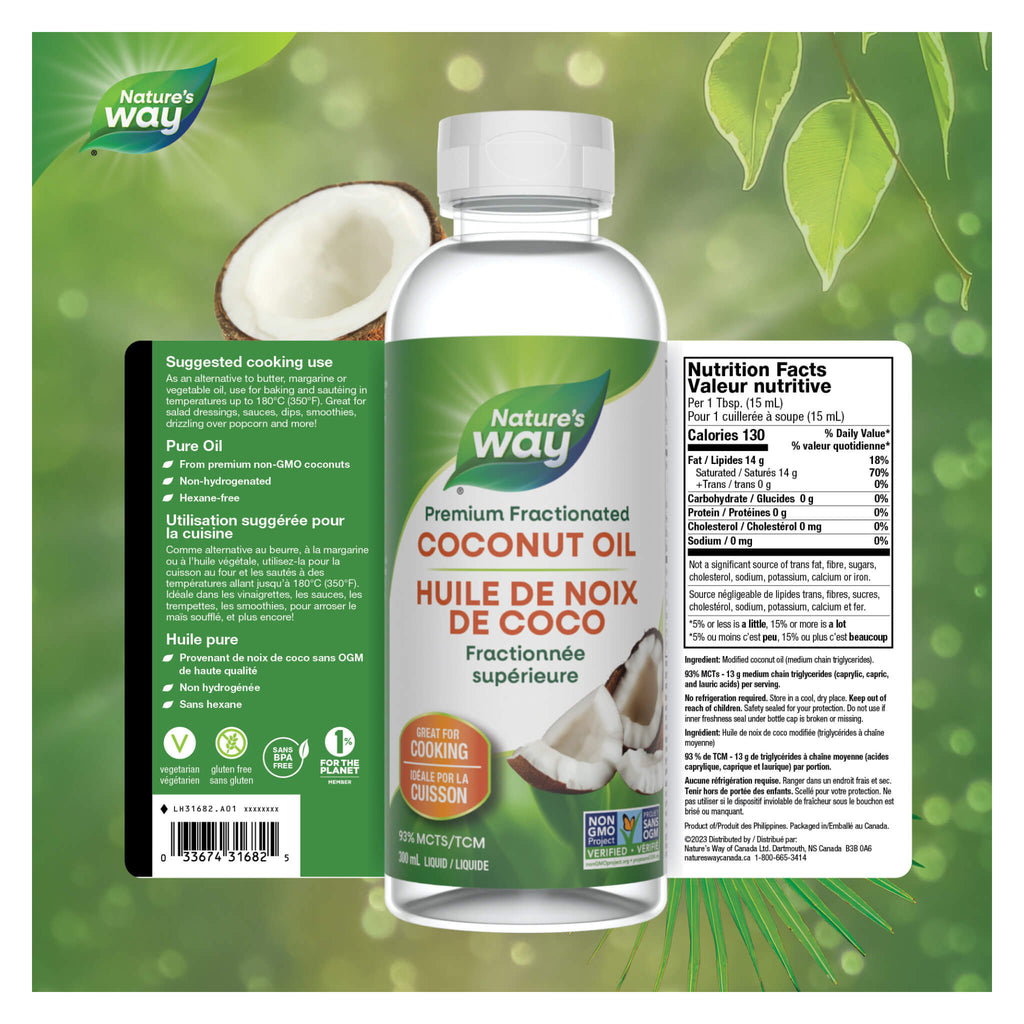 Nature's Way Premium Coconut Oil is great for cooking and can be used as an alternative to butter, margarine or vegetable oil. This pure oil is from premium non-GMO coconuts, non-hydrogenated and hexane-free. It can be used for baking and sautéing as well as salad dressings, sauces, dips and more.