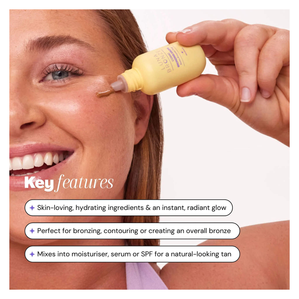 Serve face (and glow) with our instant, wash-off bronzing drops. Lightweight, hydrating and skin-enhancing, these transfer-resistant drops double as makeup enhancers, perfect for bringing a little extra bronze to your cheeks (or faking a few extra hours of sleep).