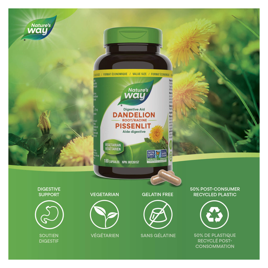 Nature's Way Dandelion Root is used in herbal medicine to help increase bile flow, to help stimulate appetite, to help treat digestive disturbances, as an alternative to help relieve dematological conditions and as a laxative. Nature's Way Dandelion Root is Vegetarian and Non-GMO Project Verified.