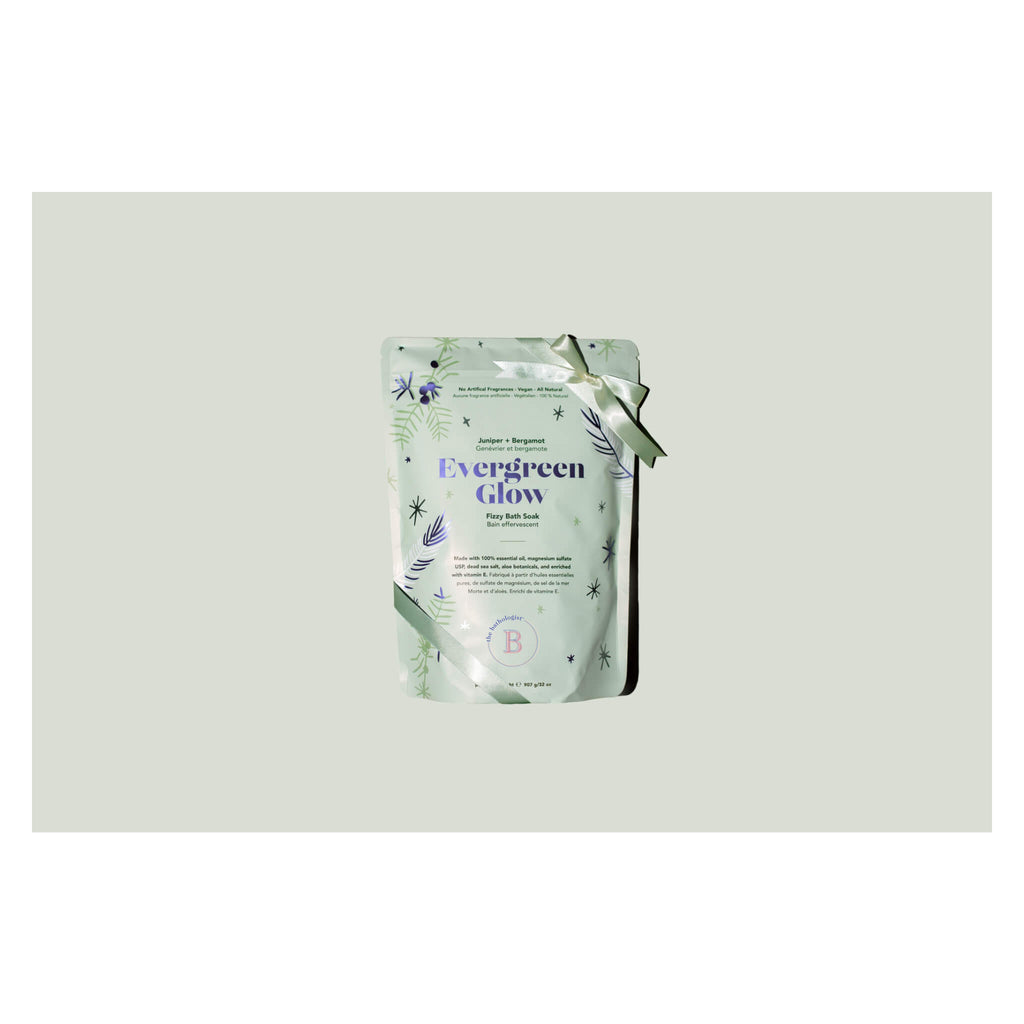 Sink into the scent of the season. Evergreen Glow blends crisp juniper with bright bergamot for a bath that feels as fresh and sparkling as a forest dusted with snow. With Epsom salt, Dead Sea salt, and skin-softening oils, this fizzy soak restores your spirit, revives tired muscles, and wraps you in holiday calm.