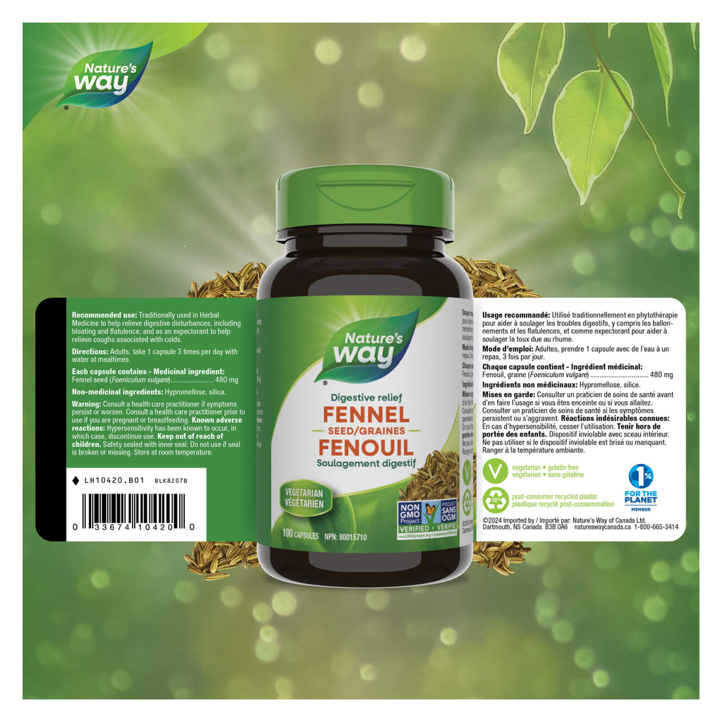 Nature's Way Fennel Seed is traditionally used in herbal medicine to help relieve digestive disturbances including bloating and flatulence and as an expectorant to help relieve coughs associated with colds. Nature's Way Fennel Seed is Vegetarian and Non-GMO Project Verified.