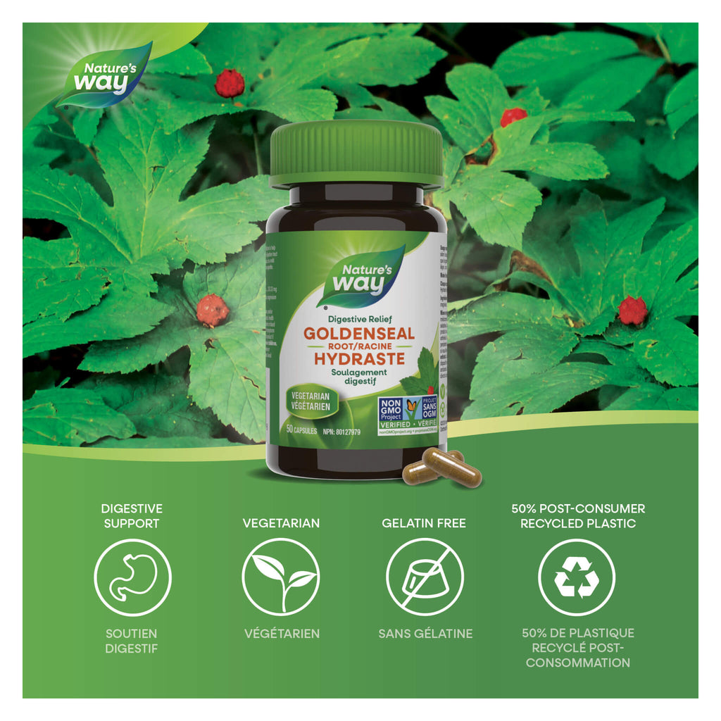 Nature's Way Goldenseal Root is traditionally used in Herbal Medicine to help alleviate infectious and inflammatory conditions of the digestive tract such as gastritis and digestive upset such as dyspepsia, as a mild laxative, and as a bitter to aid digestion and to increase appetite. Nature's Way Goldenseal Root is Vegetarian and Non-GMO Project Verified.