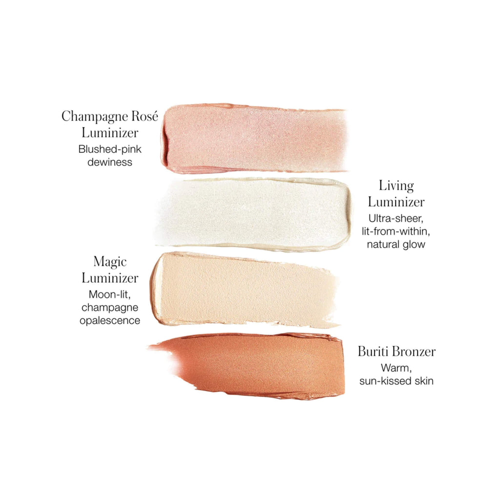 This palette contains: Luminizers in Living Luminizer, Champagne Rosé Luminizer, Magic Luminizer, Buriti Bronzer.