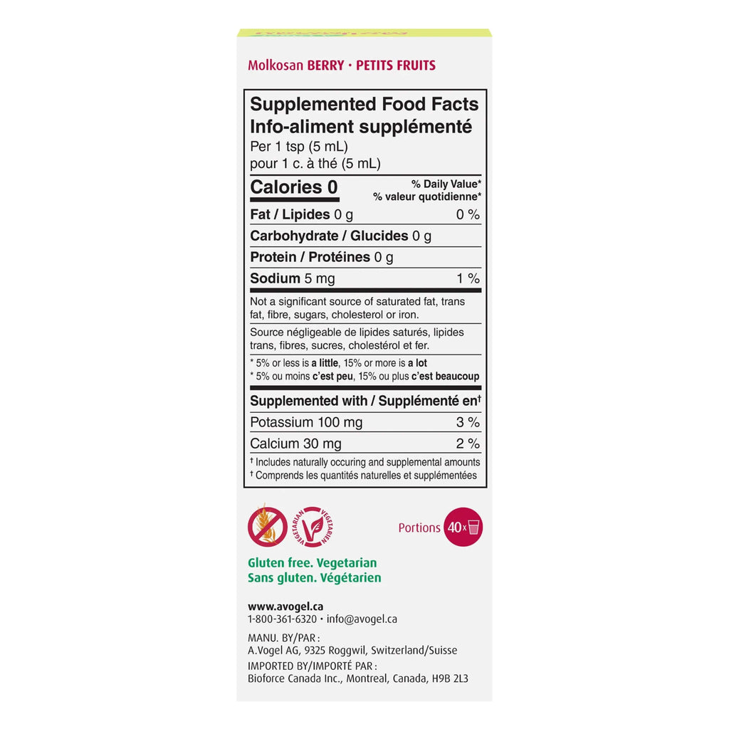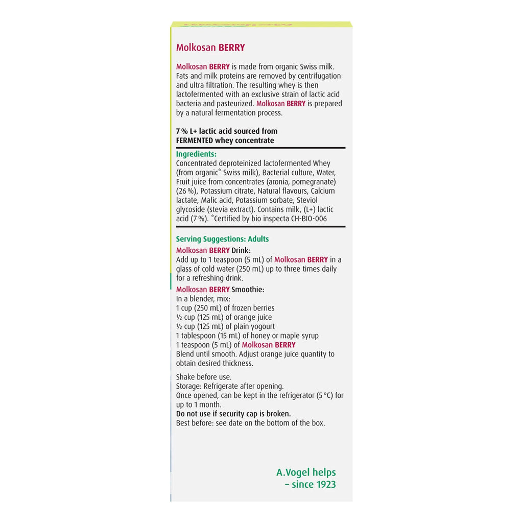 Molkosan BERRY is made from organic Swiss milk. Fats and milk proteins are removed by centrifugation and ultra filtration. The resulting whey is then lactofermented with an exclusive strain of lactic acid bacteria and pasteurized.