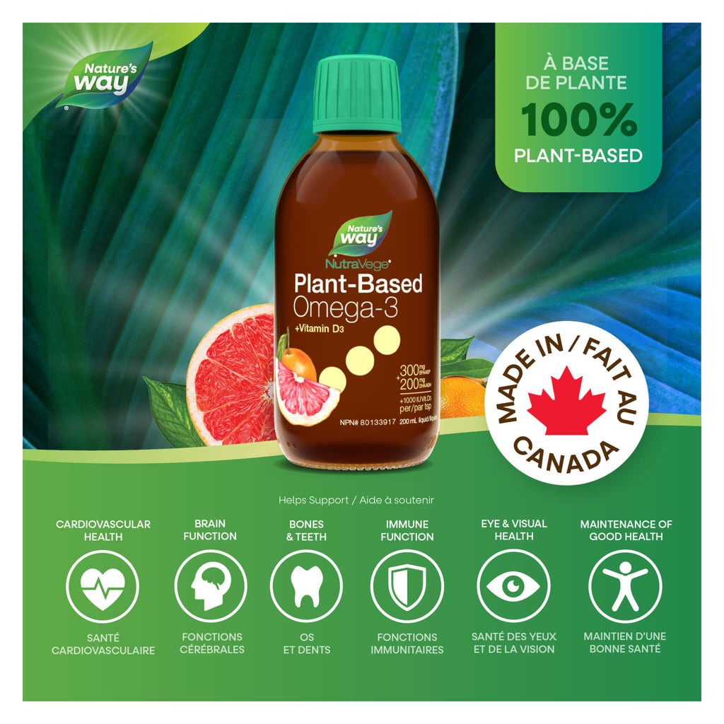 NutraVege is a plant-based omega-3 formula that's so good, you take it with a spoon. With 300mg of EPA + 200mg of DHA from algal oil plus 1000 IU vegan vitamin D, NutraVege is 100% vegetarian and vegan-friendly. NutraVege helps to support the maintenance of good health as well as eye, brain, and cardiovascular health. Vitamin D also helps support the development and maintenance of bones and teeth. Just one teaspoon (5ml) a day in a delicious grapefruit tangerine flavour.