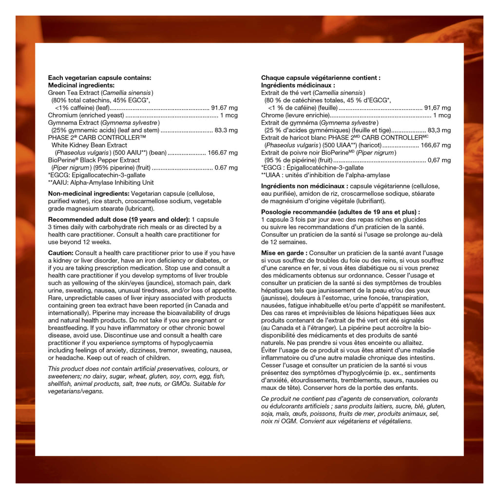 Cautions & Warnings: Consult a health care practitioner prior to use if you have a kidney or liver disorder, have an iron deficiency or diabetes, or if you are taking prescription medication. Stop use and consult a health care practitioner if you develop symptoms of liver trouble such as yellowing of the skin/eyes (jaundice), stomach pain, dark urine, sweating, nausea, unusual tiredness, and/or loss of appetite. Rare, unpredictable cases of liver injury associated with products containing green tea extract have been reported (in Canada and internationally). Piperine may increase the bioavailability of drugs and natural health products. Do not take if you are pregnant or breastfeeding. If you have inflammatory or other chronic bowel disease, avoid use. Discontinue use and consult a health care practitioner if you experience symptoms of hypoglycemia including feelings of anxiety, dizziness, tremor, sweating, nausea, or headache. Keep out of reach of children.