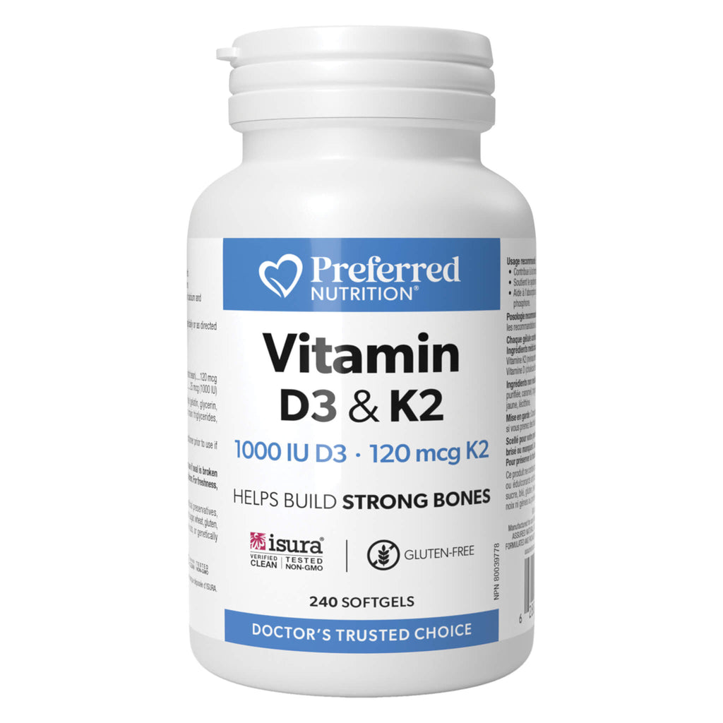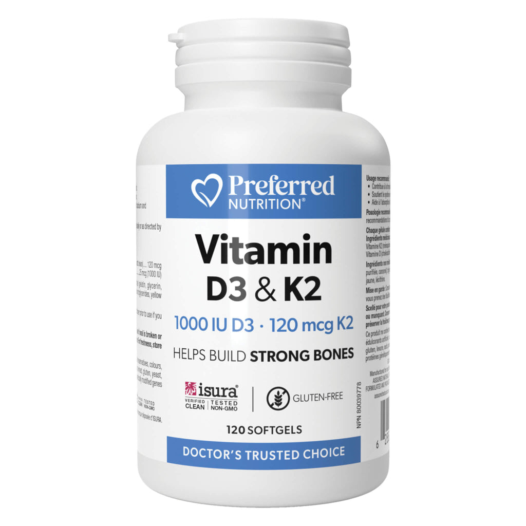 Preferred Nutrition Vitamin D3 & K2 combines the biologically active MK-7 form of vitamin K2 with active vitamin D3 (as cholecalciferol) to help build strong bones and teeth while supporting immune function. Each daily softgel provides 120 mcg of vitamin K2 derived naturally from natto beans, along with 1000 IU of vitamin D3.