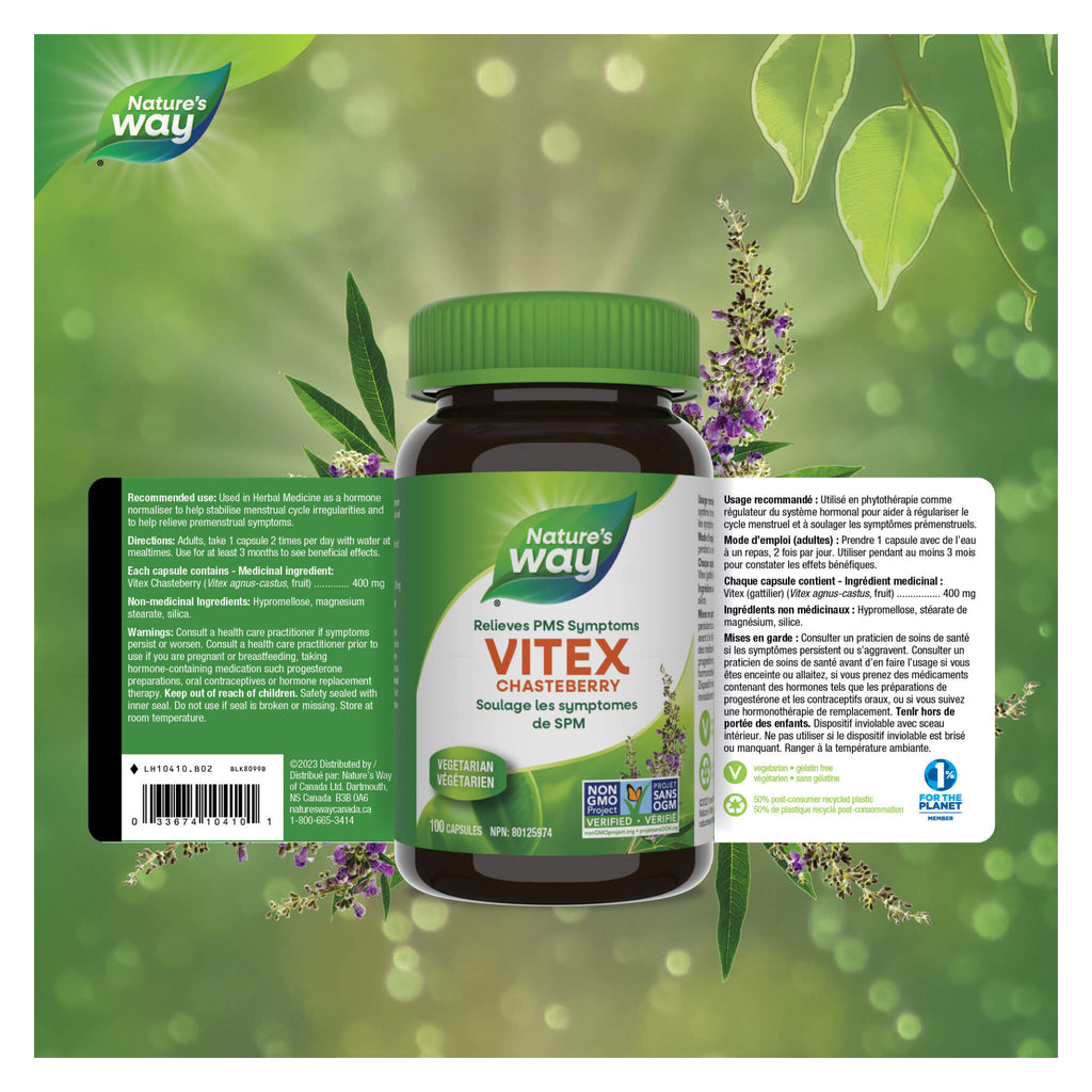 Nature's Way Vitex Chasteberry is used in herbal medicine to relieve the symptoms of premenstrual syndrome (PMS). Nature's Way Vitex Chasteberry is Vegetarian and Non-GMO Project Verified.